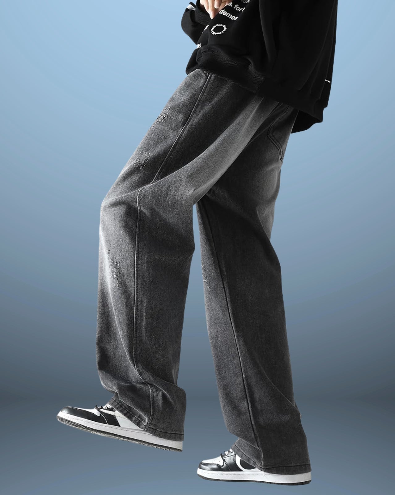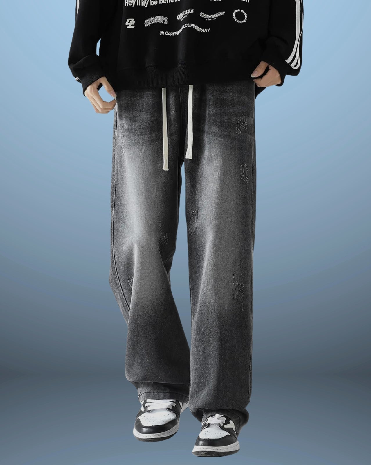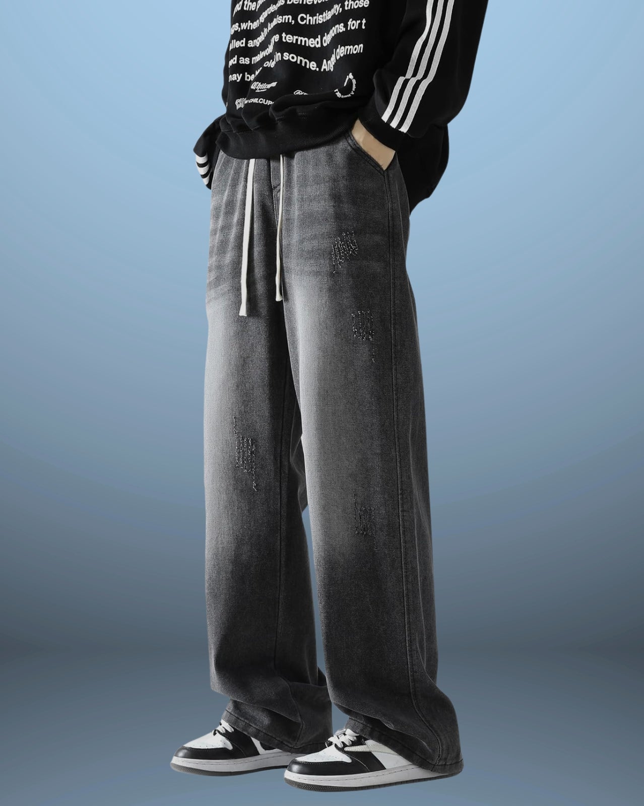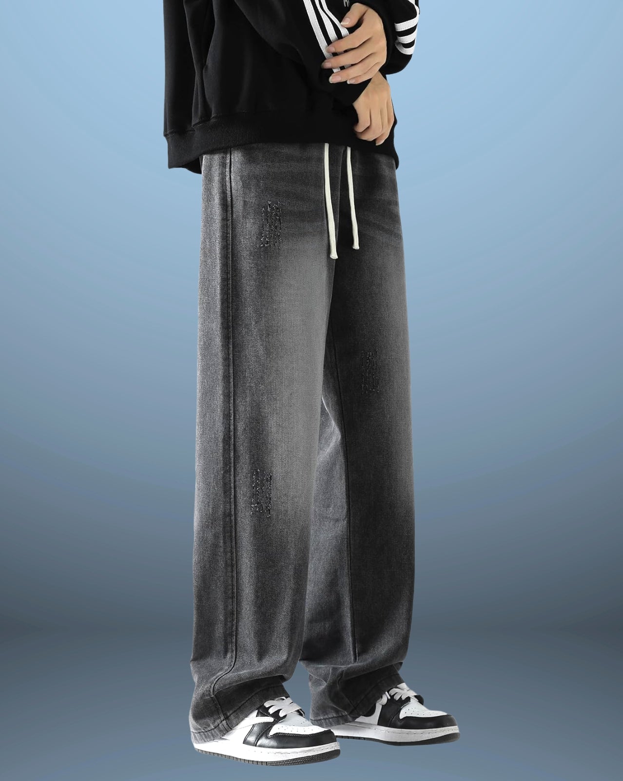 The Distressed Denim Jeans showcase a relaxed, wide-leg fit with worn-in, faded patches that add authentic character. The adjustable drawstring waist ensures a comfortable fit, while quality denim construction makes these jeans ideal for casual, everyday style with an edge.